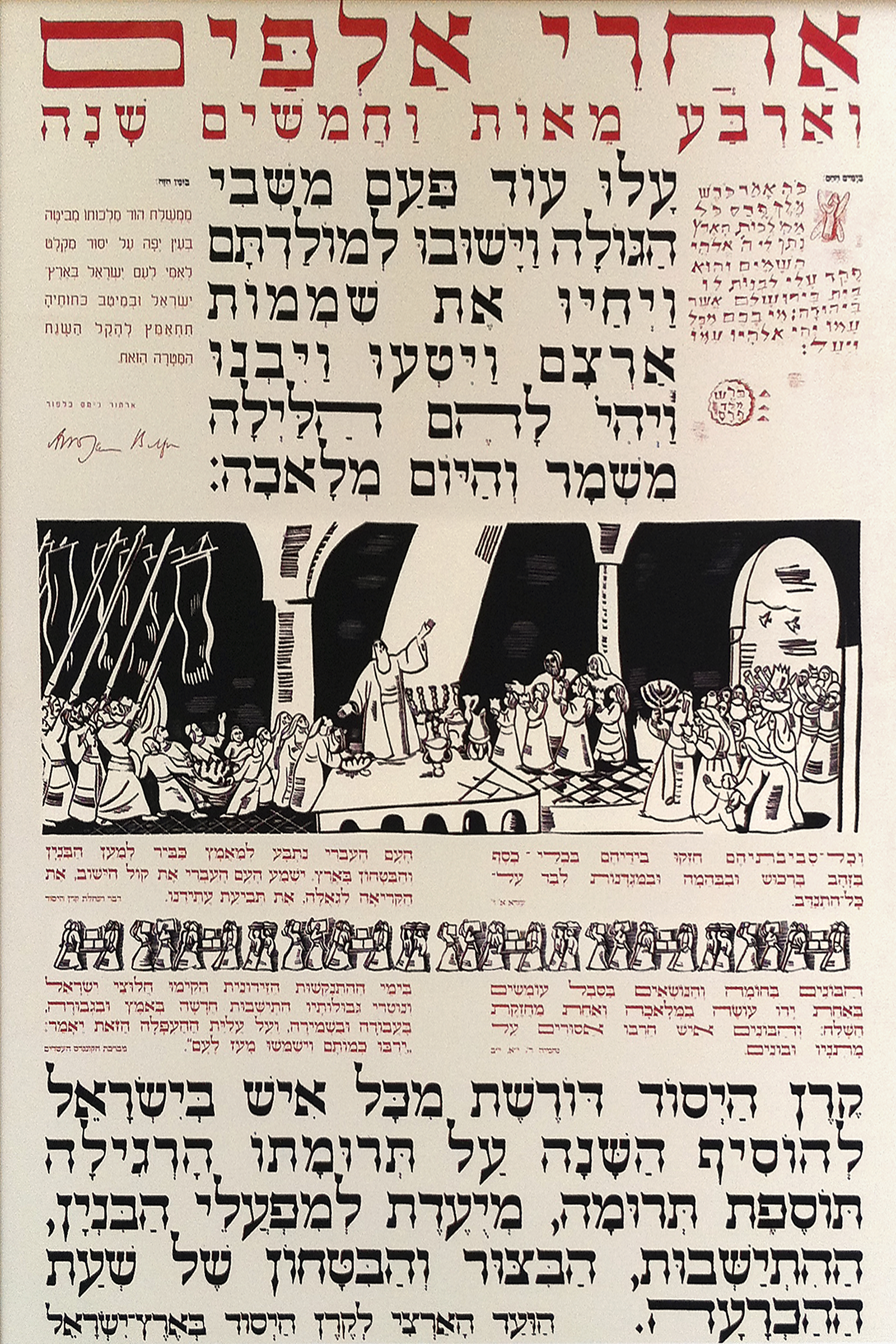 This 1937 United Israel Appeal poster, designed by Nahum Gutman, is titled: After 2450 Years – Jews Once Again Left the Captivity of the Diaspora and Returned to Their Homeland.