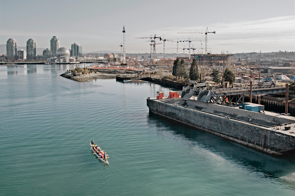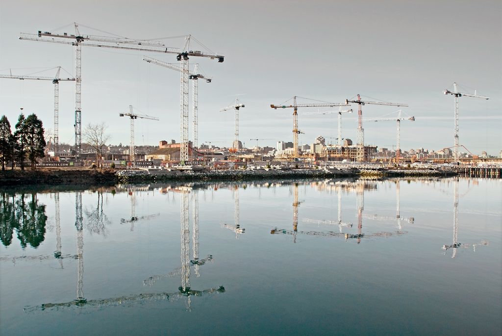 I was captivated by the vision of a dozen tower cranes moving gracefully together. Sometimes they reminded me of a finely tuned orchestra; sometimes they looked like a beautifully choreographed ballet. From that very first glance, I felt compelled to return to Southeast False Creek again and again to photograph the massive construction site of the Vancouver Athletes’ Village.