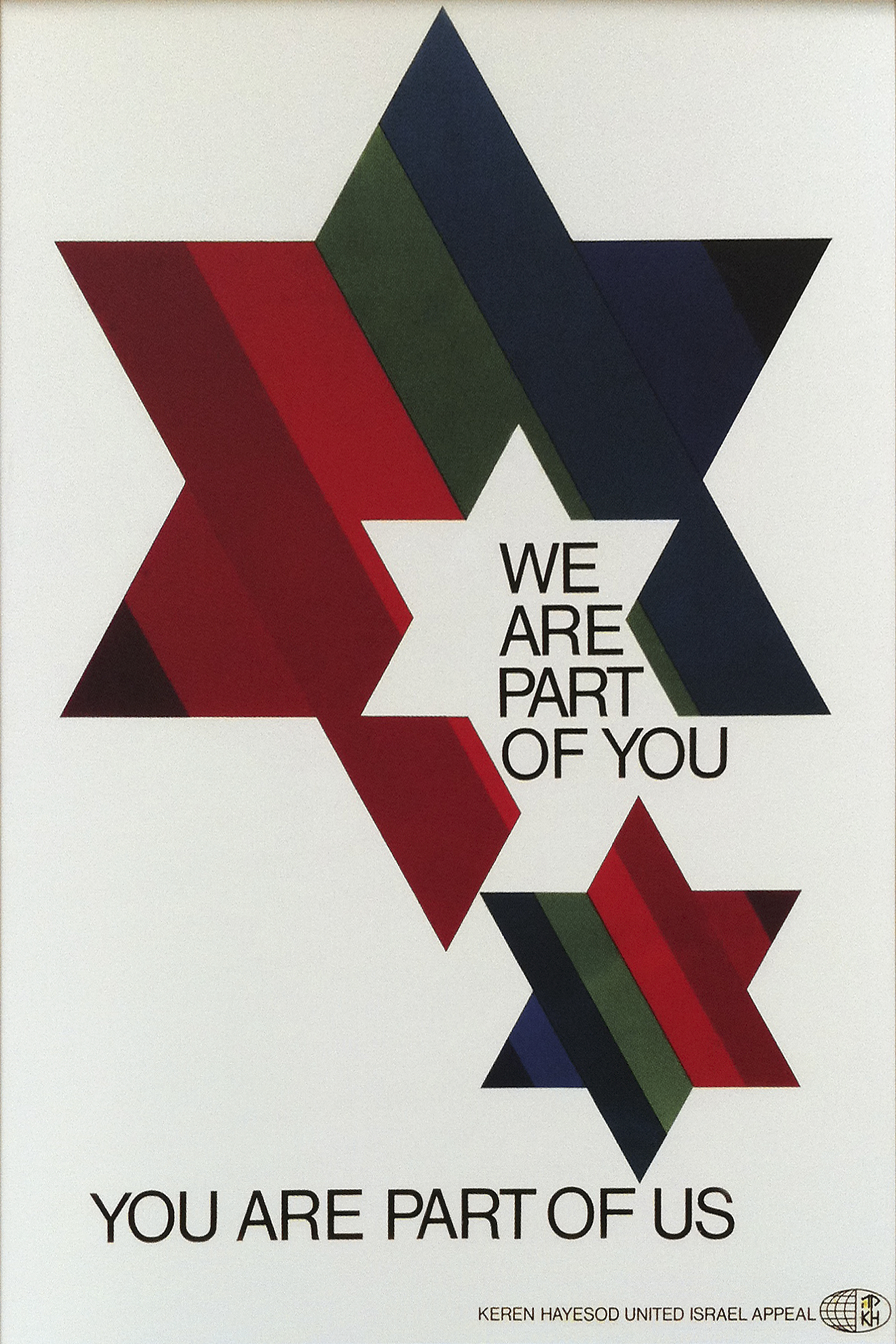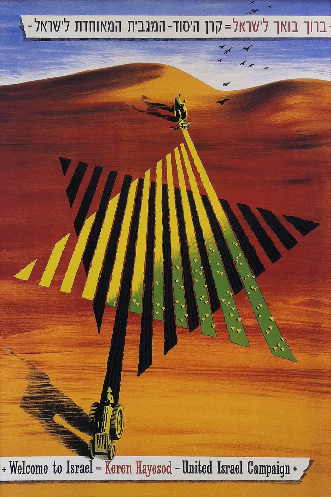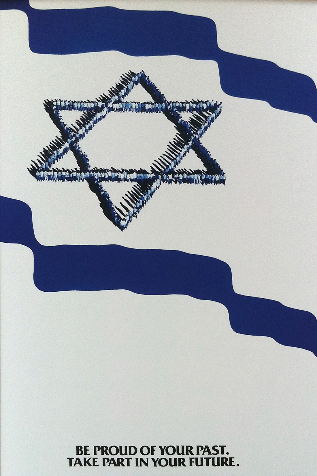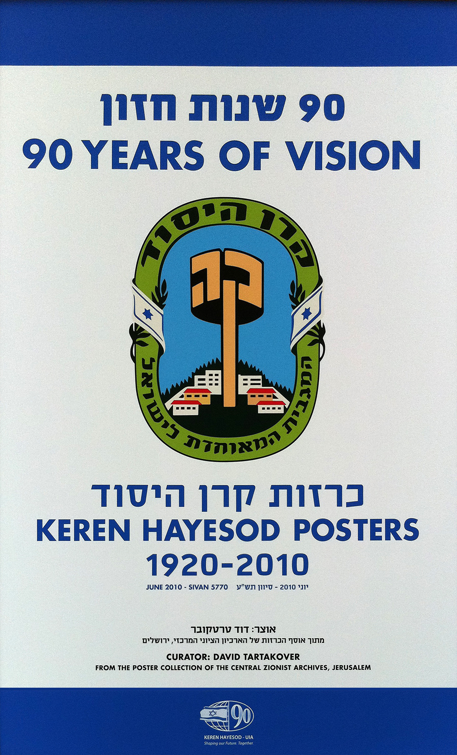 This 2010 exhibition poster, designed by David Tartakover, is titled: 90 Years of Vision, Keren Hayesod Posters 1920-2010.