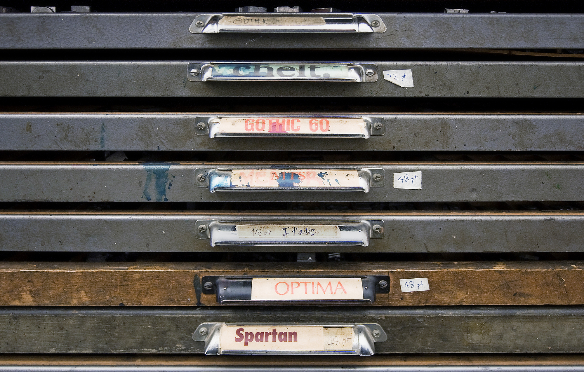 I love the mystery of what’s in these drawers. In the letterpress printing room, scores of drawers hold dozens of fonts. Each heavy type case houses intriguing treasures, from the largest wooden blocks lying in stately fashion in their own compartments, to the tiniest metal characters sorted into containers by letter. In 2010 when I took a letterpress printing workshop at the Emily Carr University of Art + Design in Vancouver, I became fascinated with wooden type. I spent more time in the letterpress room photographing the beautifully handcrafted blocks than typesetting.